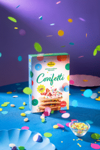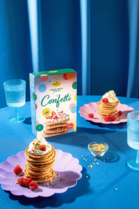 Pakuotėje yra miltų mišinys blynams ir spalvotų CONFETTI pabarstukų pakuotė. Tereiks vandens ir riebalų kepimui.
